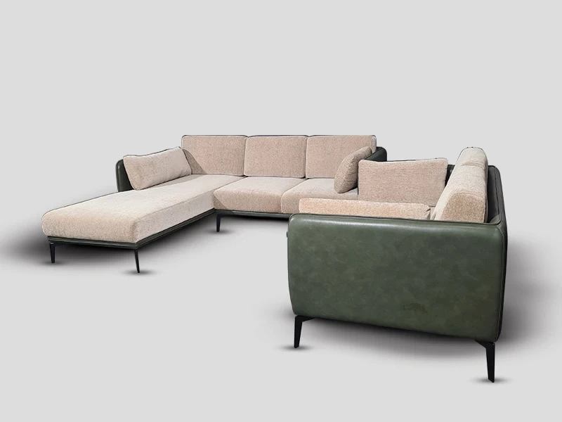 • L- shaped sofa set with two seater & one seater upholstered in imported faux leather & fabric;